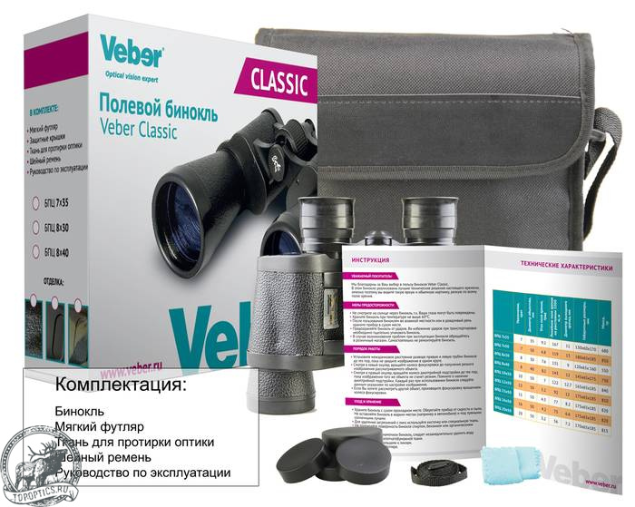 Бинокль Veber Classic БПШЦ 10x50 имеет металлический обрезиненный корпус и многослойное трудноистираемое просветляющее покрытие линз объективов и окуляров.