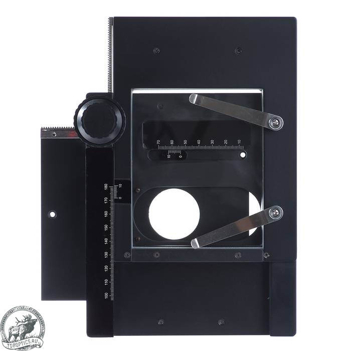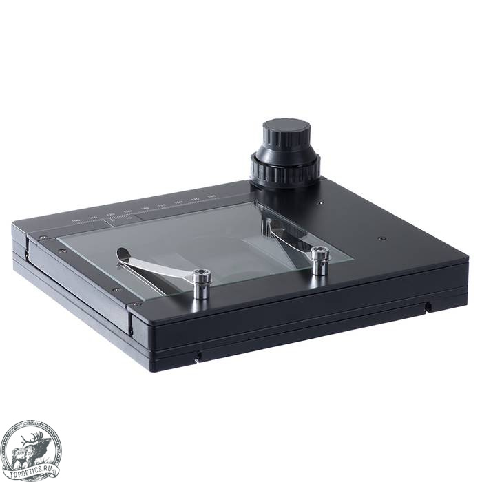 Позволяет работать с осветителем проходящего света, встроенным в основание микроскопа, так и с осветителями отраженного света. В комплект столика входят два пружинных держателя препарата.