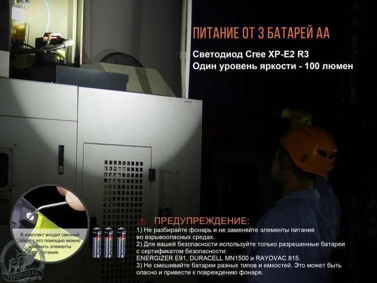 В отличие от других фонарей бренда, корпус данной модели изготавливается из антистатического пластика и сделан полностью изолированным. Даже для установки в него батареек, придется воспользоваться дополнительным шестигранным ключом. Этот аксессуар входит в стандартную комплектацию и его не придется докупать отдельно. Естественно, пыле- и влагоизоляция оболочки фонаря также находится на высоком уровне — IPX-8.