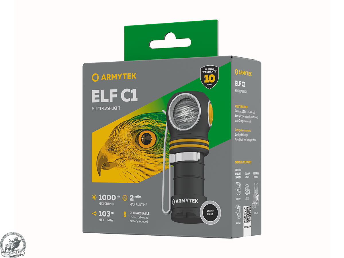 - EDC-фонарь на каждый день. Elf C1 станет отличным универсальным решением для любых задач: широкая засветка 120° и дальность до 103 метров. Профессиональное использование: Armytek Elf C1 полюбился автомеханикам — встроенный магнит на торце позволяет закрепить фонарь на любой металлической поверхности, освещая область работы перед собой, отлично работает в качестве налобного при выполнении ремонтных работ любой сложности. Незаменимая вещь в любой отрасли, где требуется что-либо ремонтировать и строить.