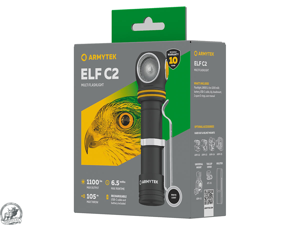 - EDC-фонарь на каждый день. Elf C2 станет отличным универсальным решением для любых задач: широкая засветка 120° и дальность до 105 метров. Профессиональное использование: форм-фактор Armytek Elf C2 полюбился автомеханикам — встроенный магнит на торце позволяет закрепить фонарь на любой металлической поверхности, освещая область работы перед собой, отлично работает в качестве налобного при выполнении ремонтных работ любой сложности. Незаменимая вещь в любой отрасли, где требуется что-либо ремонтировать и строить.