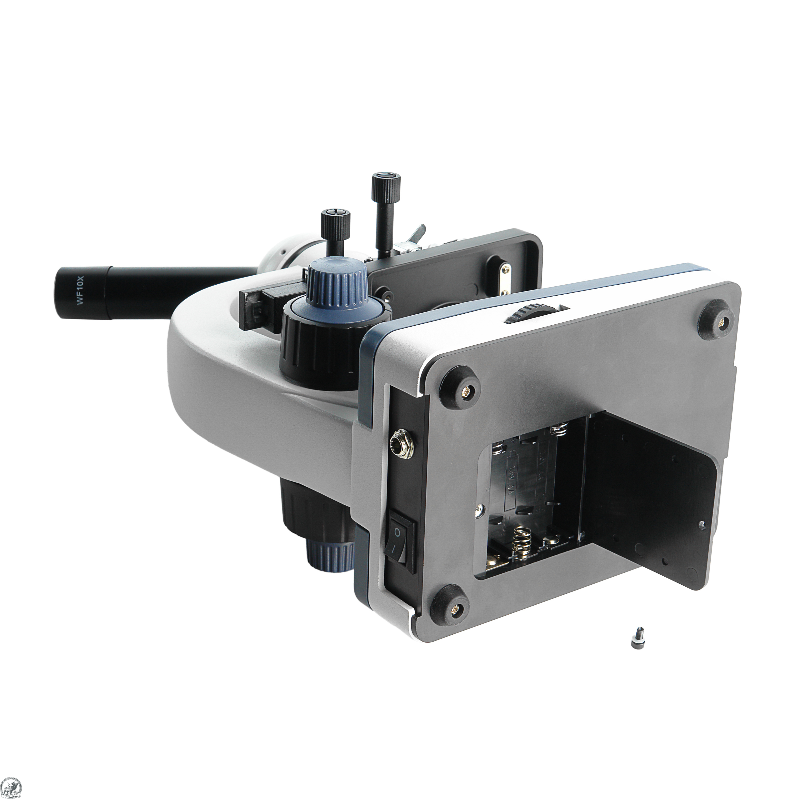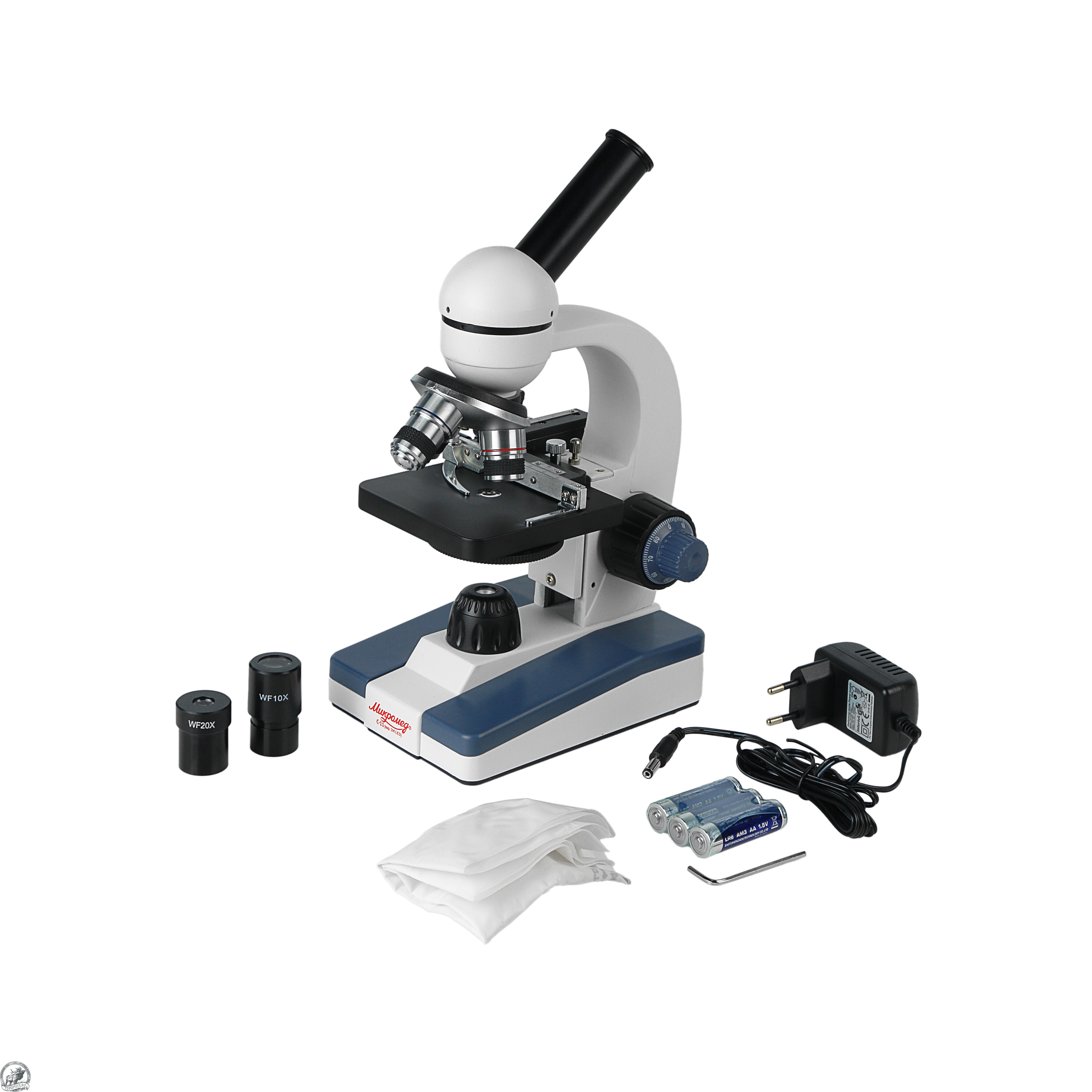 Осветитель снабжен коллекторной линзой, что повышает равномерность и яркость освещения предмета исследования и имеет бесступенчатую регулировку яркости. Питание микроскопа производится от 3-х щелочных батареек тип АА или от входящего в комплект сетевого адаптера.