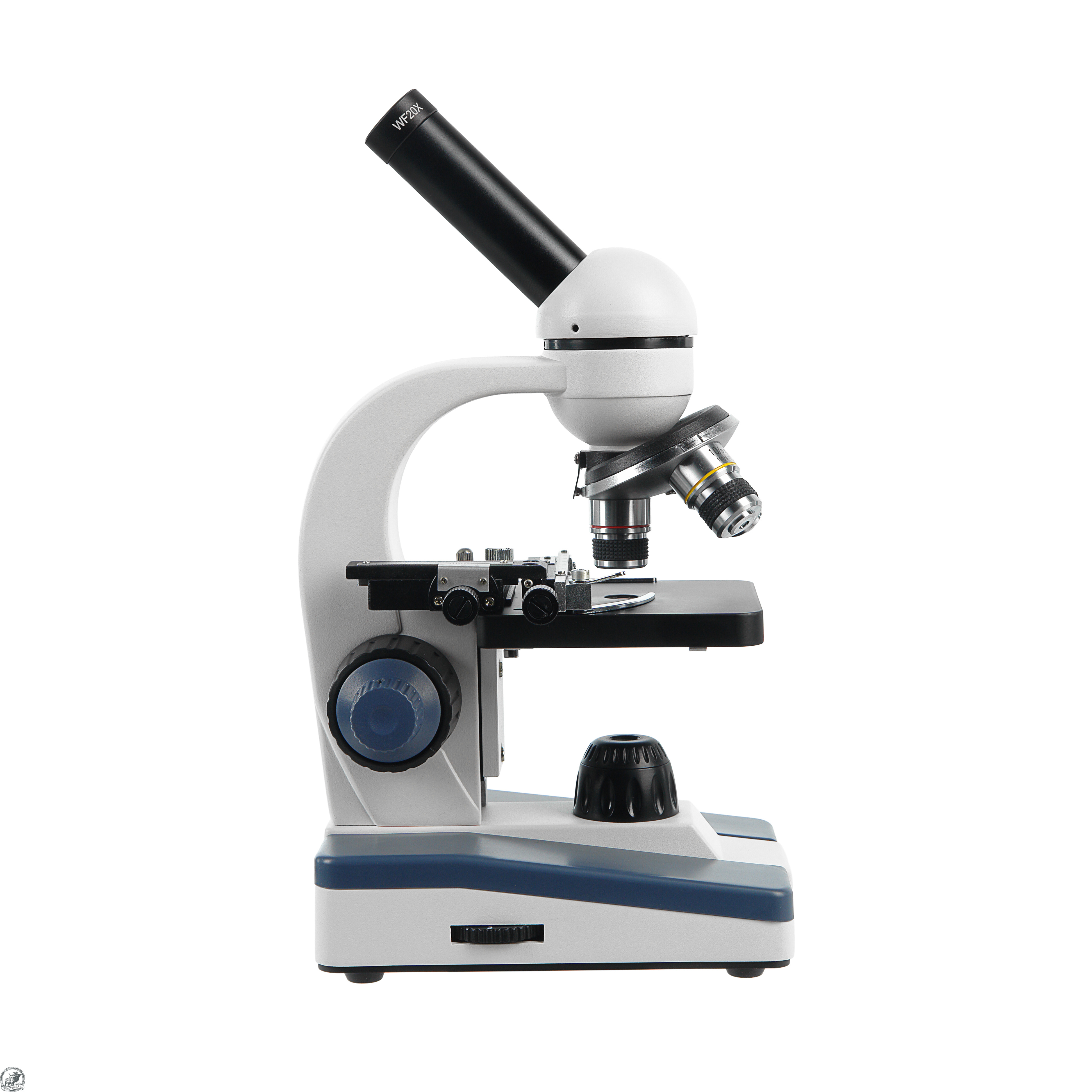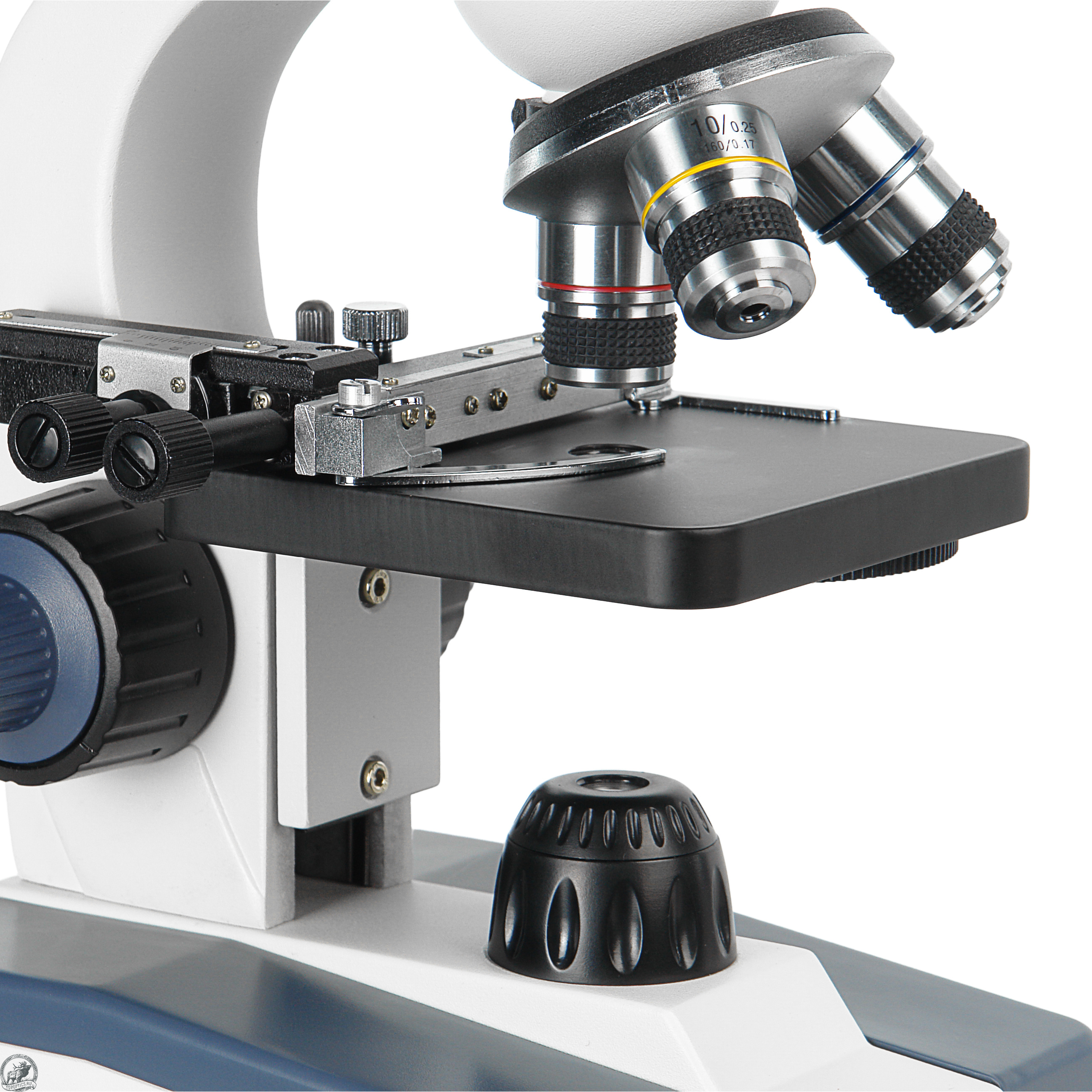 Все объективы парфокальны, поэтому при смене увеличений наводка на резкость не теряется. Объективы микроскопа установлены на револьверном устройстве, рассчитанном на 3 объектива, что позволяет наблюдателю быстро переходить к исследованиям с различными увеличениями.