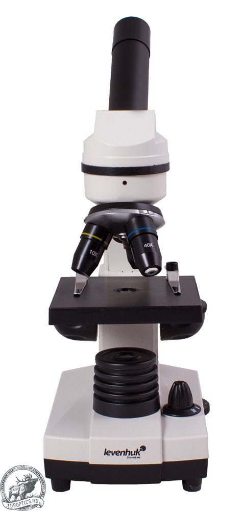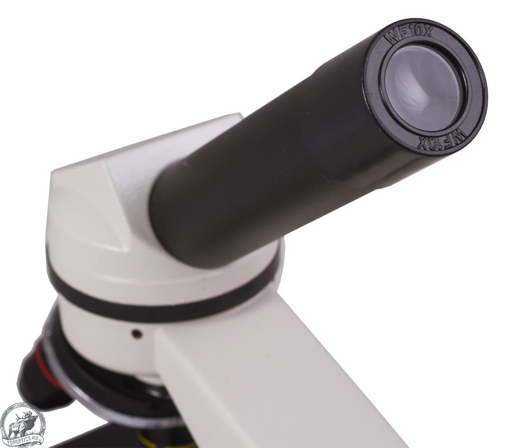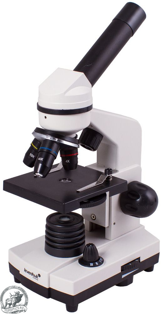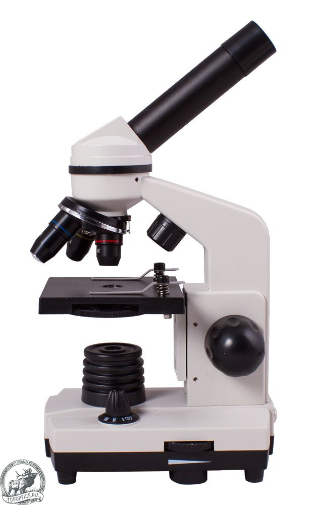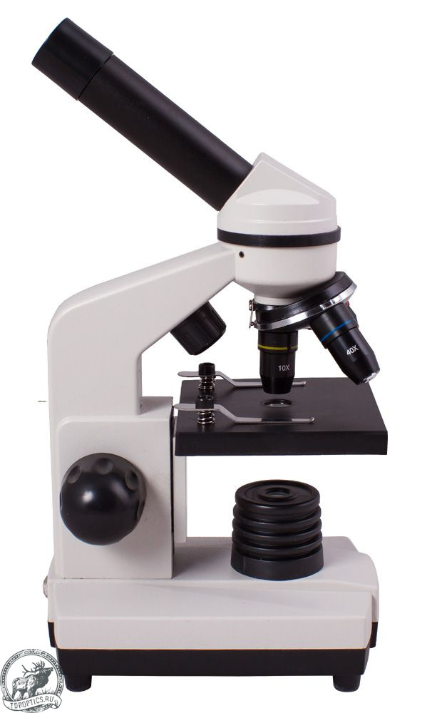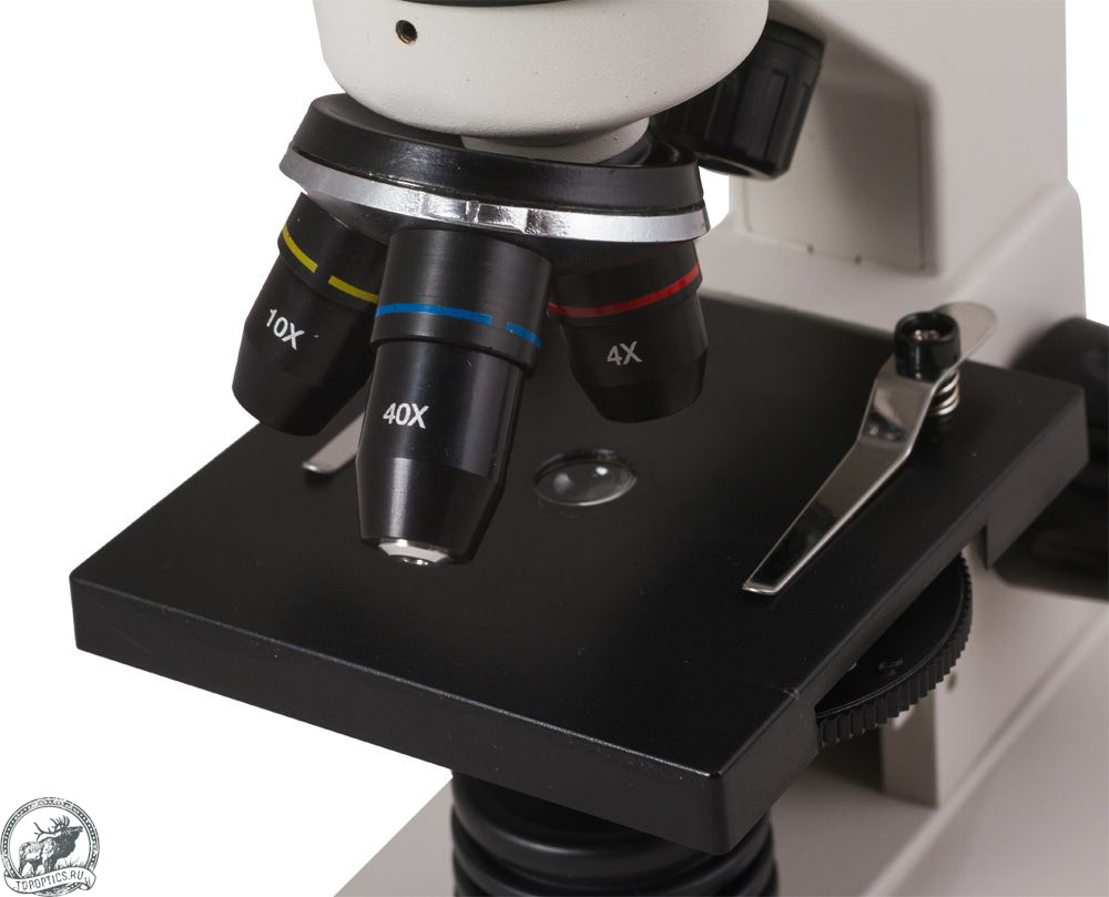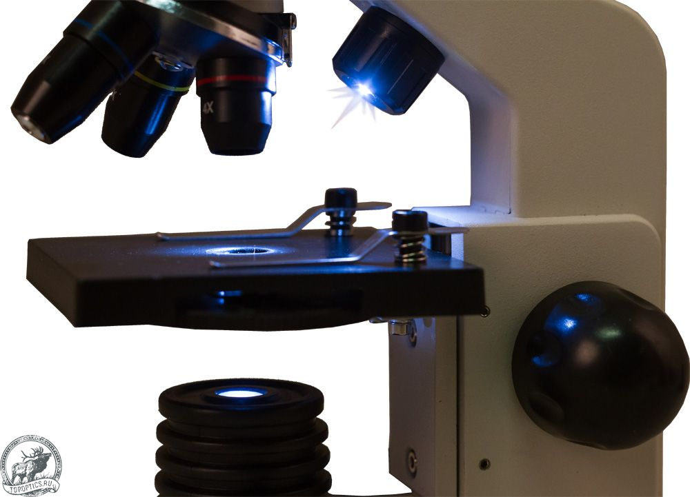 Качественная стеклянная оптика формирует контрастную и четкую картинку. Для лучшего светопропускания на линзы нанесено многослойное просветляющее покрытие. Микроскоп комплектуется тремя объективами, с которыми он дает увеличение в диапазоне от 40 до 400 крат. Чтобы поменять кратность, нужно только повернуть револьверное устройство.
