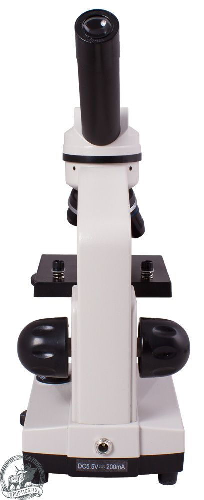 Корпус сделан из прочного пластика, так что микроскоп получился одновременно надежным и легким. Для комфортного использования окулярная насадка наклонена на 45°. Микроскоп может работать как от сети переменного тока, так и от батареек – его можно использовать даже на открытом воздухе.