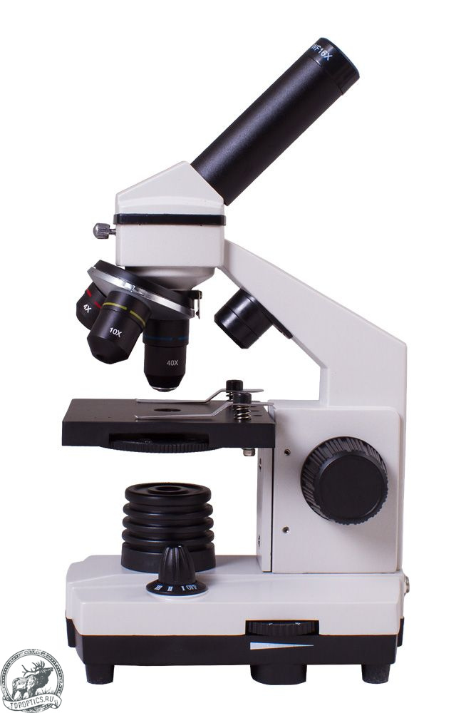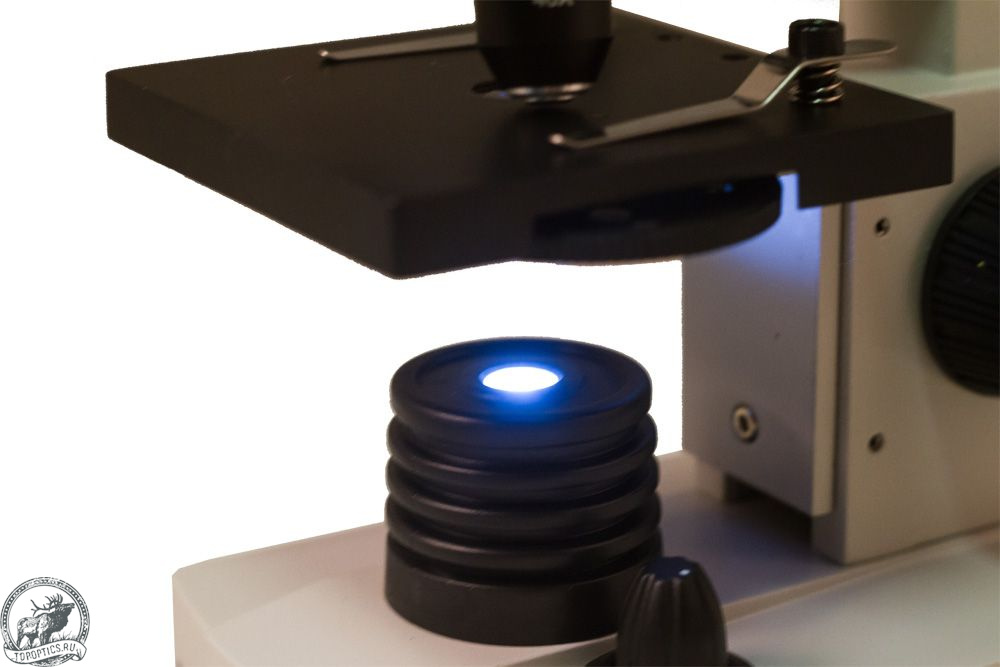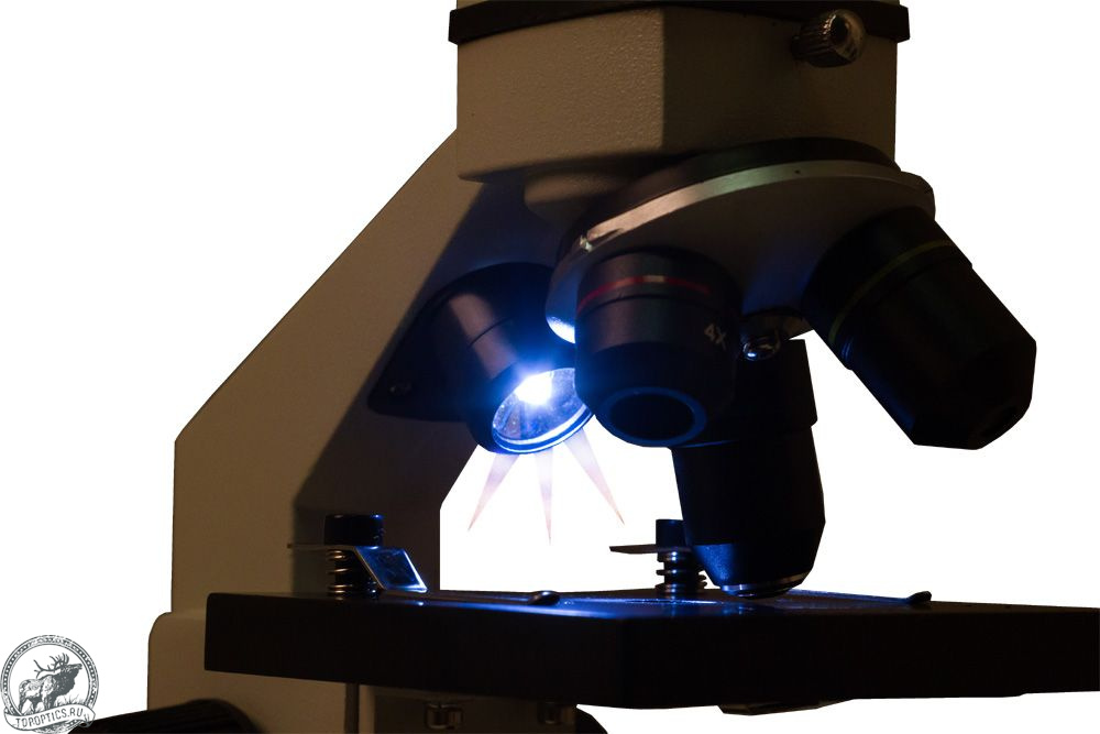 Микроскоп комплектуется тремя объективами: 4x, 10x и 40xs. Для смены кратности достаточно просто повернуть револьверное устройство. Объектив 40xs снабжен защитным пружинным механизмом. Если при фокусировке опустить объектив слишком низко и коснуться им покровного стекла, подпружиненный объектив отодвинется – и оптика, и препарат останутся целыми.