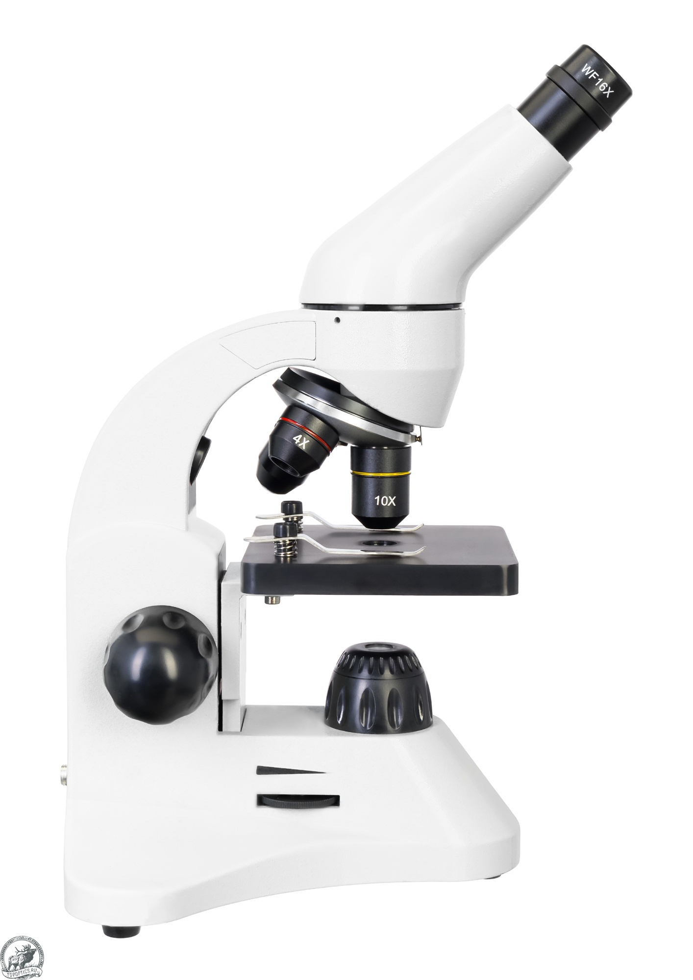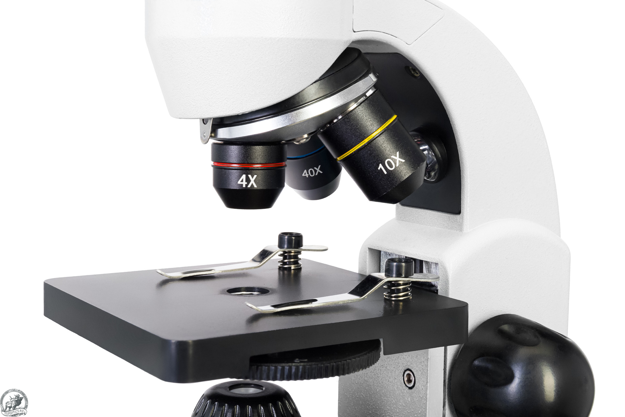 Три объектива позволяют получить широкий диапазон увеличений – от 64 до 640 крат. Объектив с наибольшей кратностью снабжен пружинным механизмом, который защищает оптику от поломок. Если при фокусировке коснуться препарата объективом, он отодвинется – и оптика, и покровное стекло останутся целыми. В комплект входит линза Барлоу, которая удваивает кратность с каждым объективом. Максимальное увеличение микроскопа при этом достигает 1280 крат!