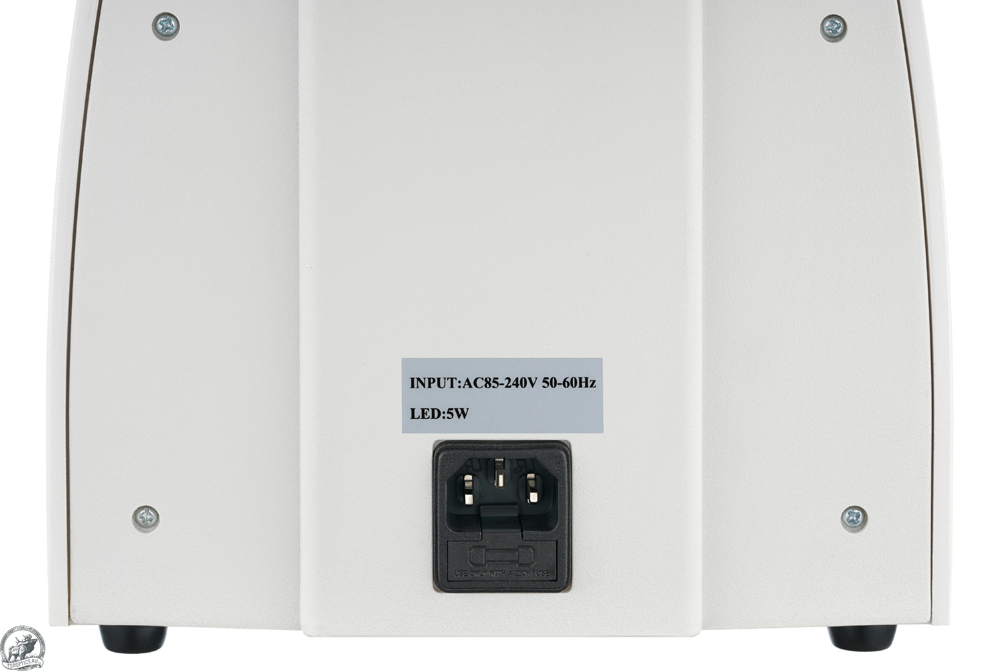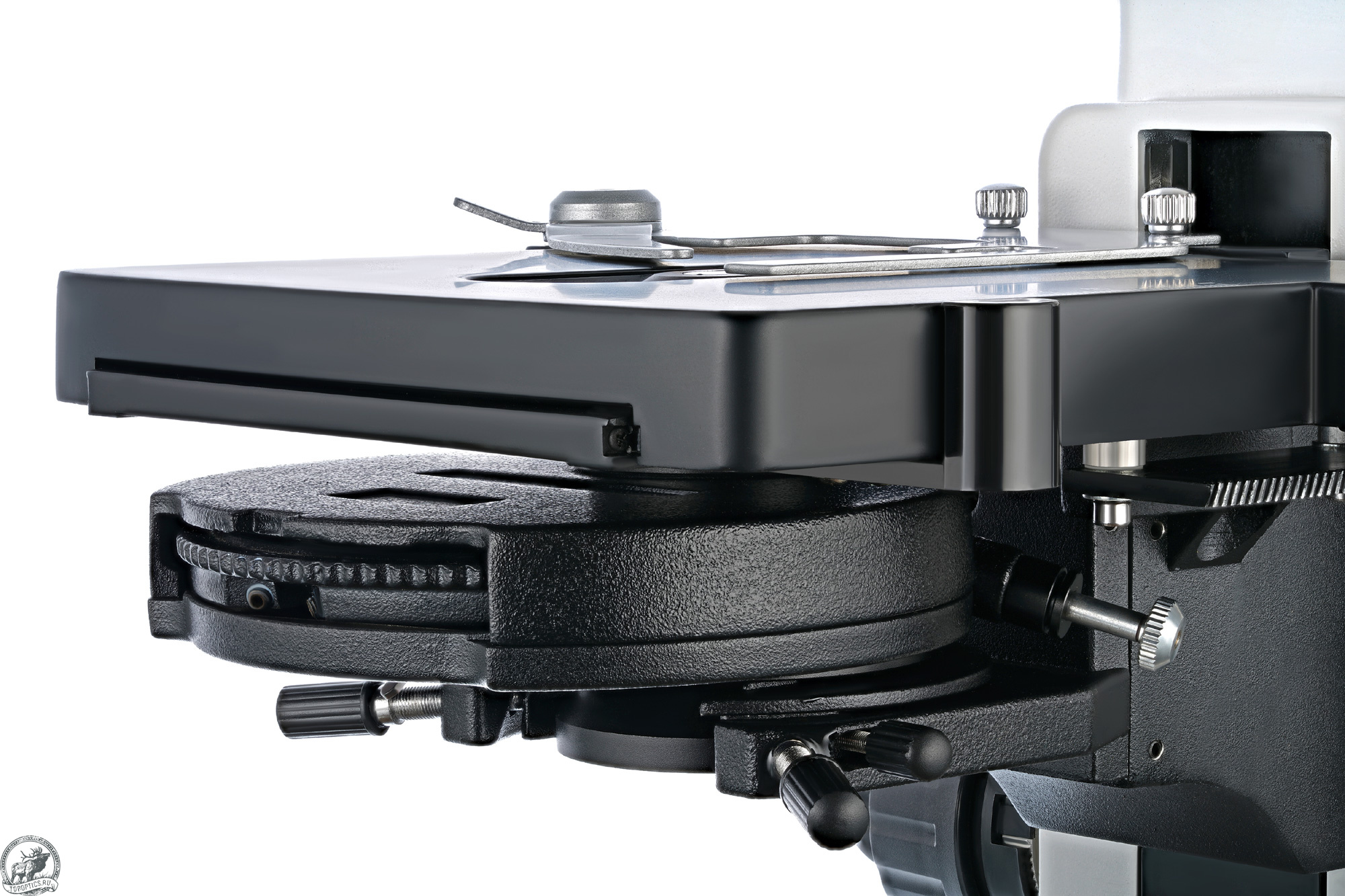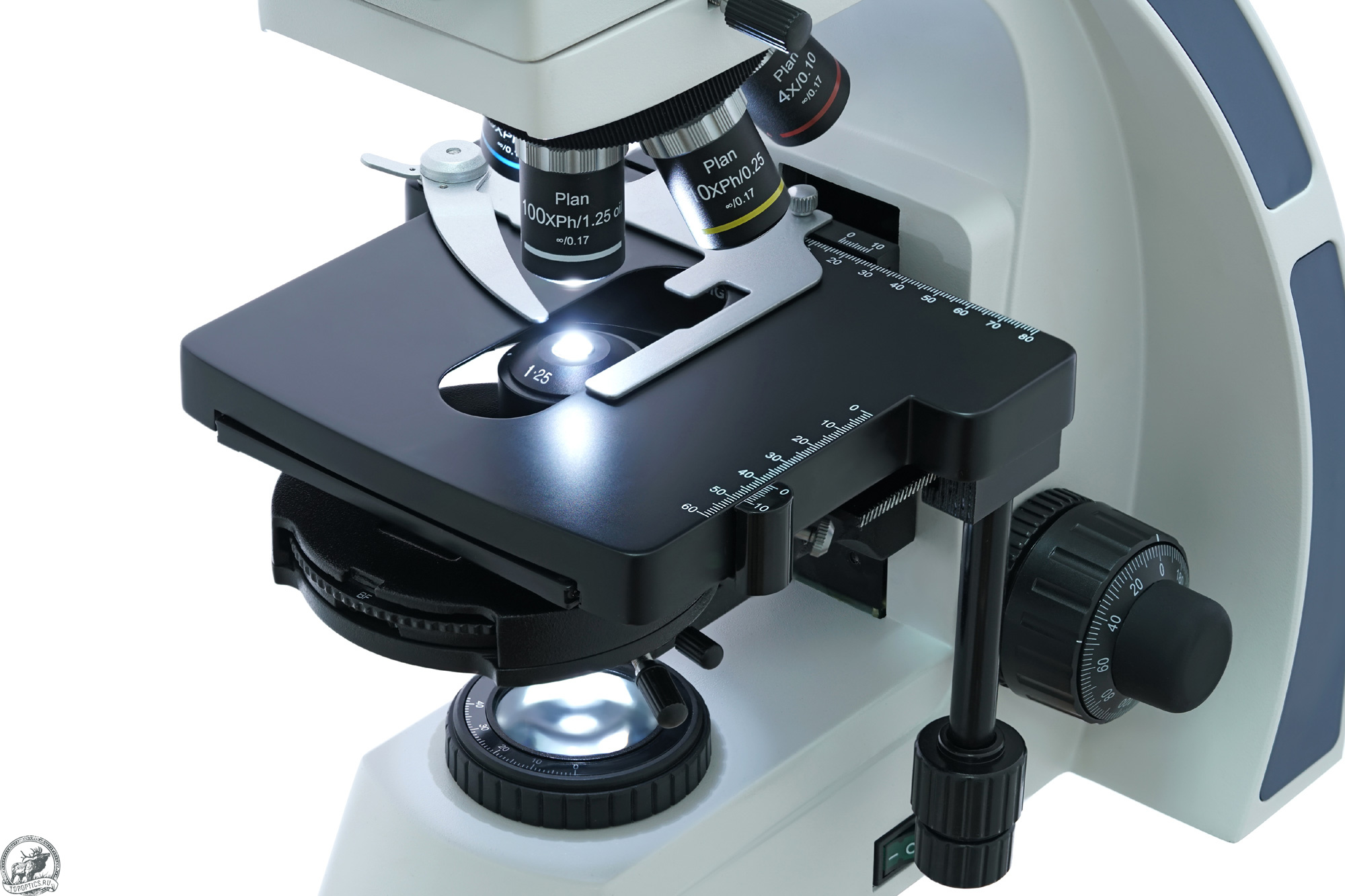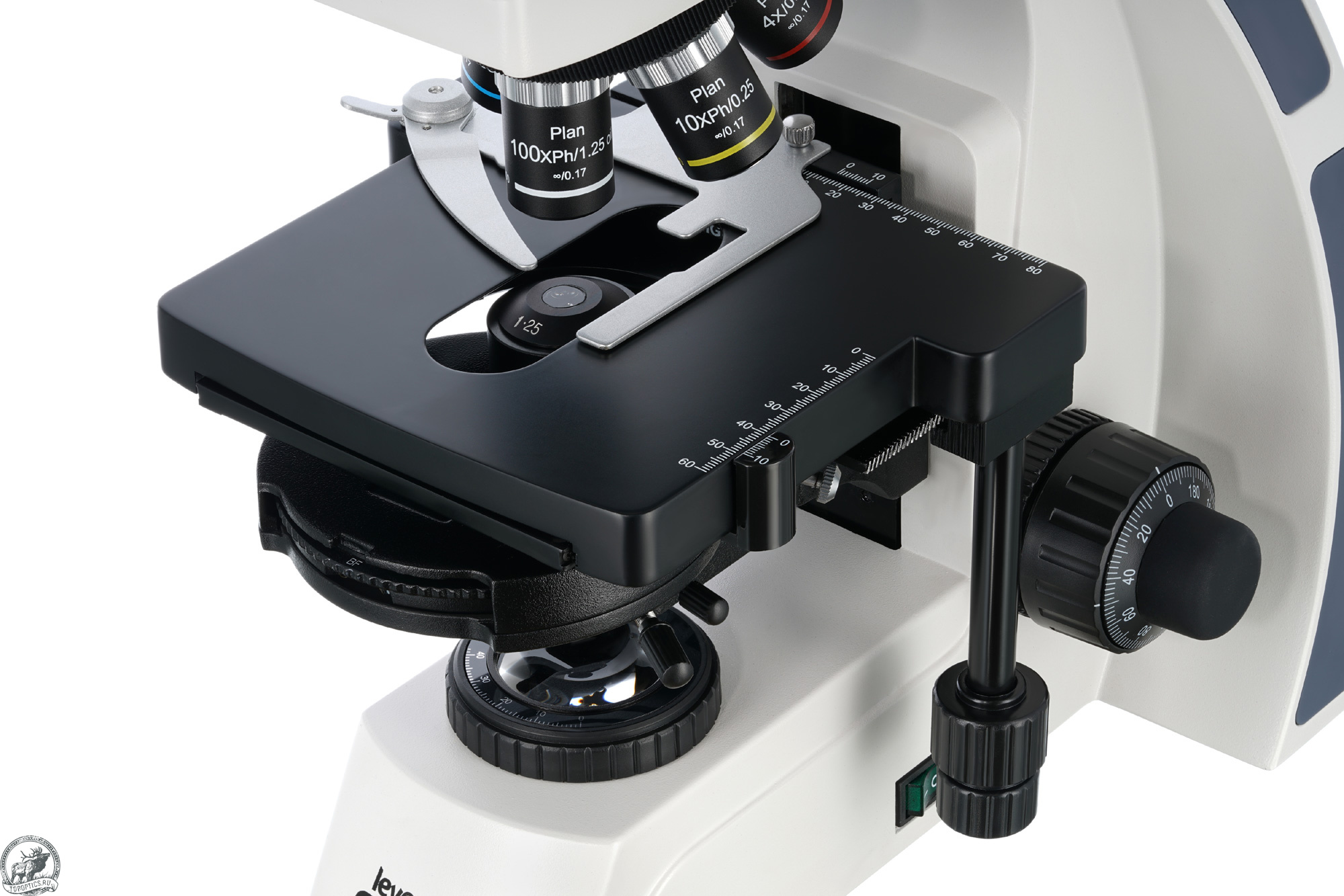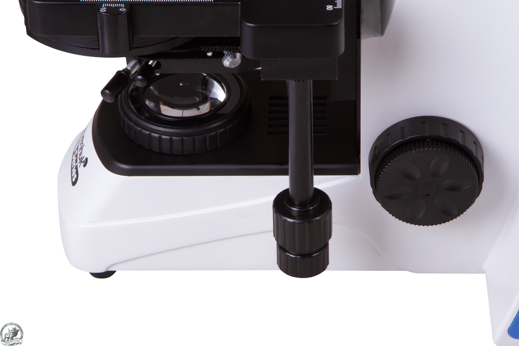 У двухкоординатного предметного столика есть препаратоводитель. Под столиком находится фазовый конденсор (темное поле можно использовать только при «сухом» методе наблюдений), еще ниже – светодиодная подсветка с регулировкой яркости. Для работы подсветки требуется подключение к сети переменного тока.