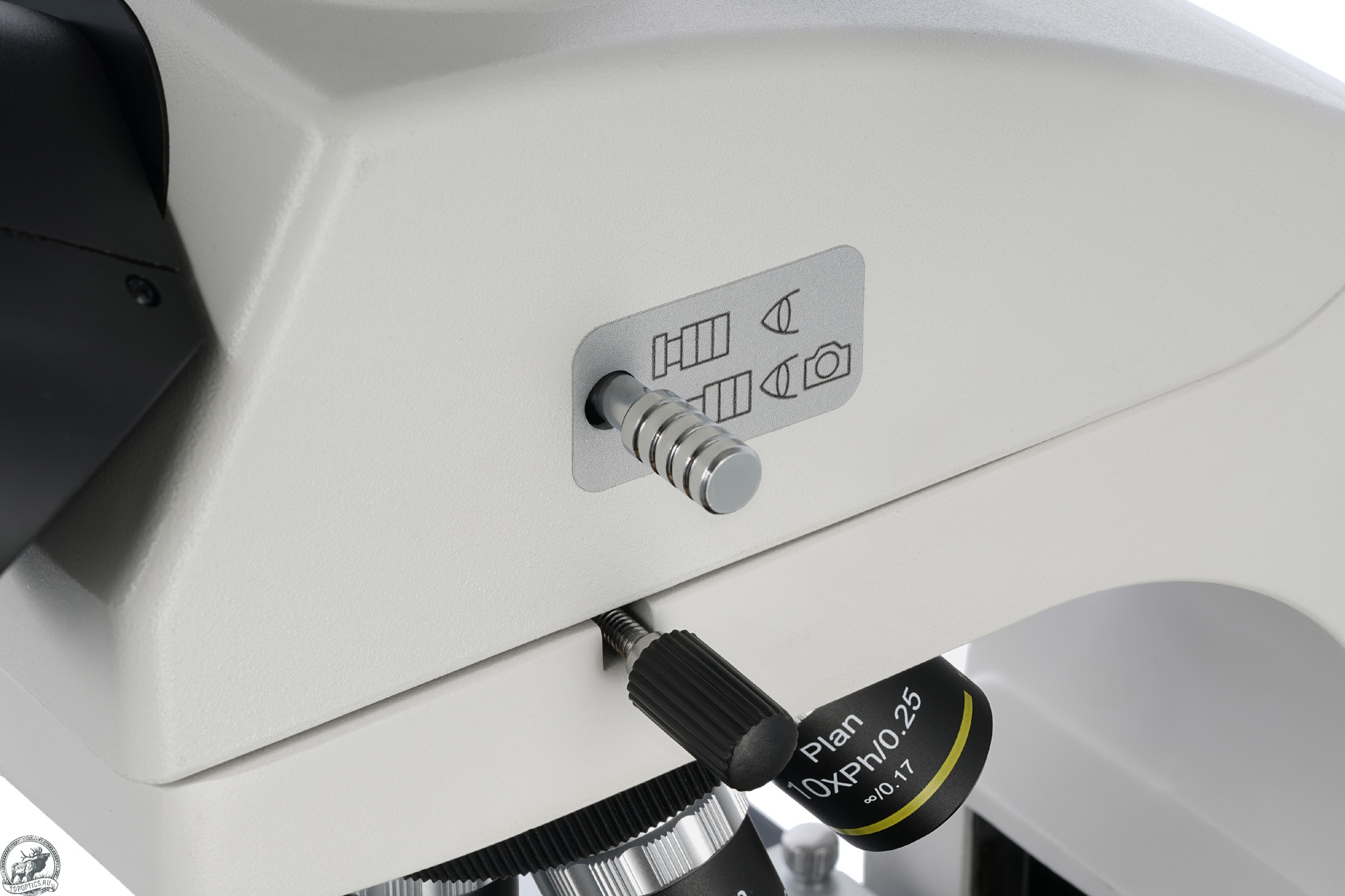 Камера делает работу в лаборатории более легкой и удобной, так как позволяет снизить нагрузку на зрение – нет необходимости непрерывно смотреть в окуляры, поскольку картинка показывается на ЖК-экране в реальном времени. Кроме того, к камере можно подключать внешние накопители данных, наушники, компьютерную мышь и другие аксессуары. С помощью установленного ПО можно корректировать размер, яркость, контрастность, гамму, резкость и насыщенность изображения, менять время выдержки и баланс белого, проводить калибровку камеры с объективами, измерять образцы или отдельные структуры (доступно несколько единиц измерения). Кроме того, программа позволяет проводить анализ частиц. Сама тринокулярная насадка вращается вокруг своей оси на 360°, а визуальная часть имеет удобный наклон в 30°.