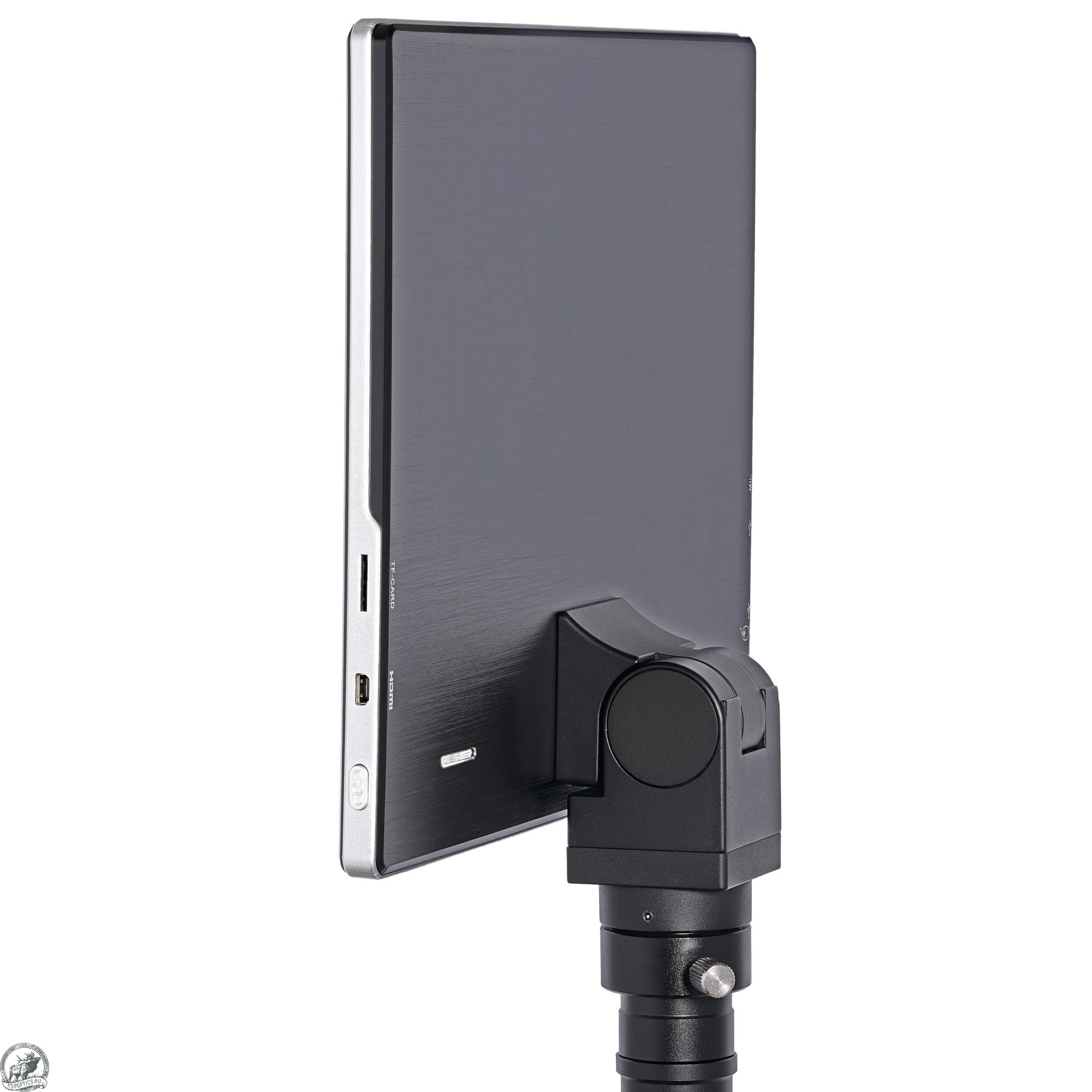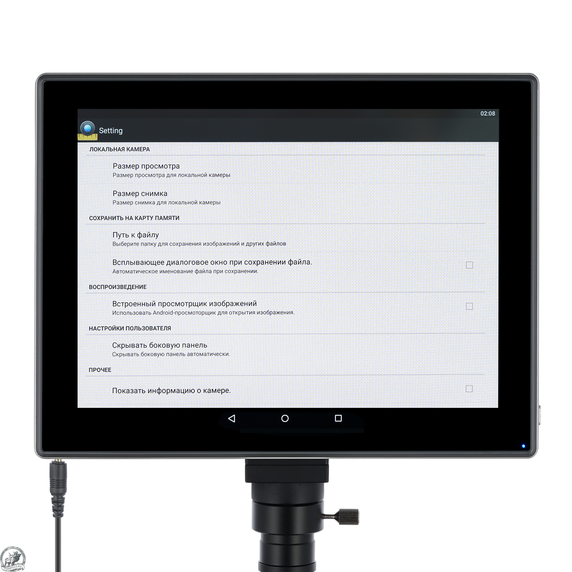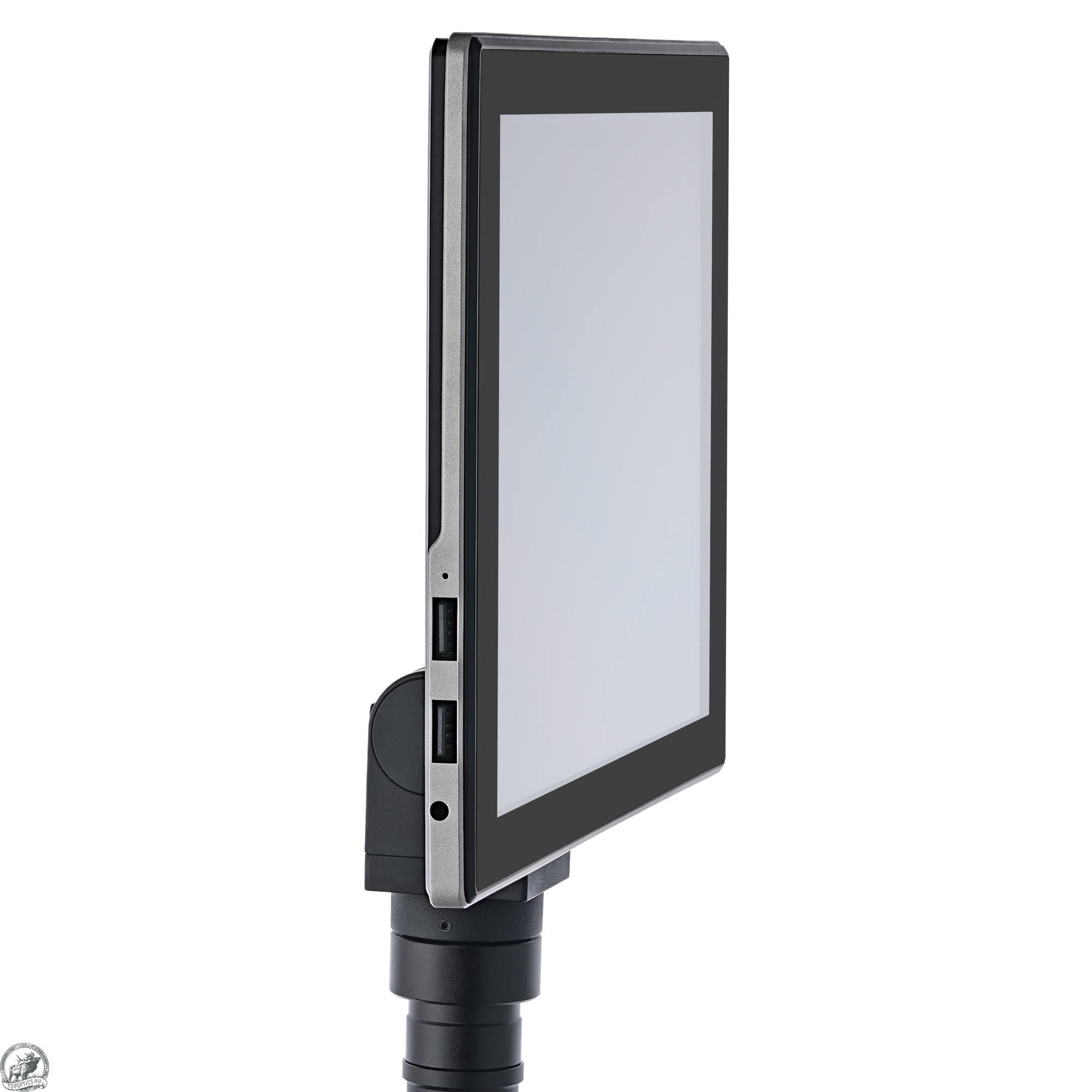 Тринокулярная насадка разделена на бинокулярный визуальный блок и отдельную окулярную трубку для установки цифровой камеры. Камера включена в комплект поставки и позволяет делать фото и записывать видео в высоком качестве. Картинку с объектива микроскопа можно выводить на встроенный ЖК-экран камеры с сенсорным управлением, а также на подключенный внешний монитор или телевизор. Установка программ или драйверов не требуется – камера готова к работе сразу после подключения к сети.