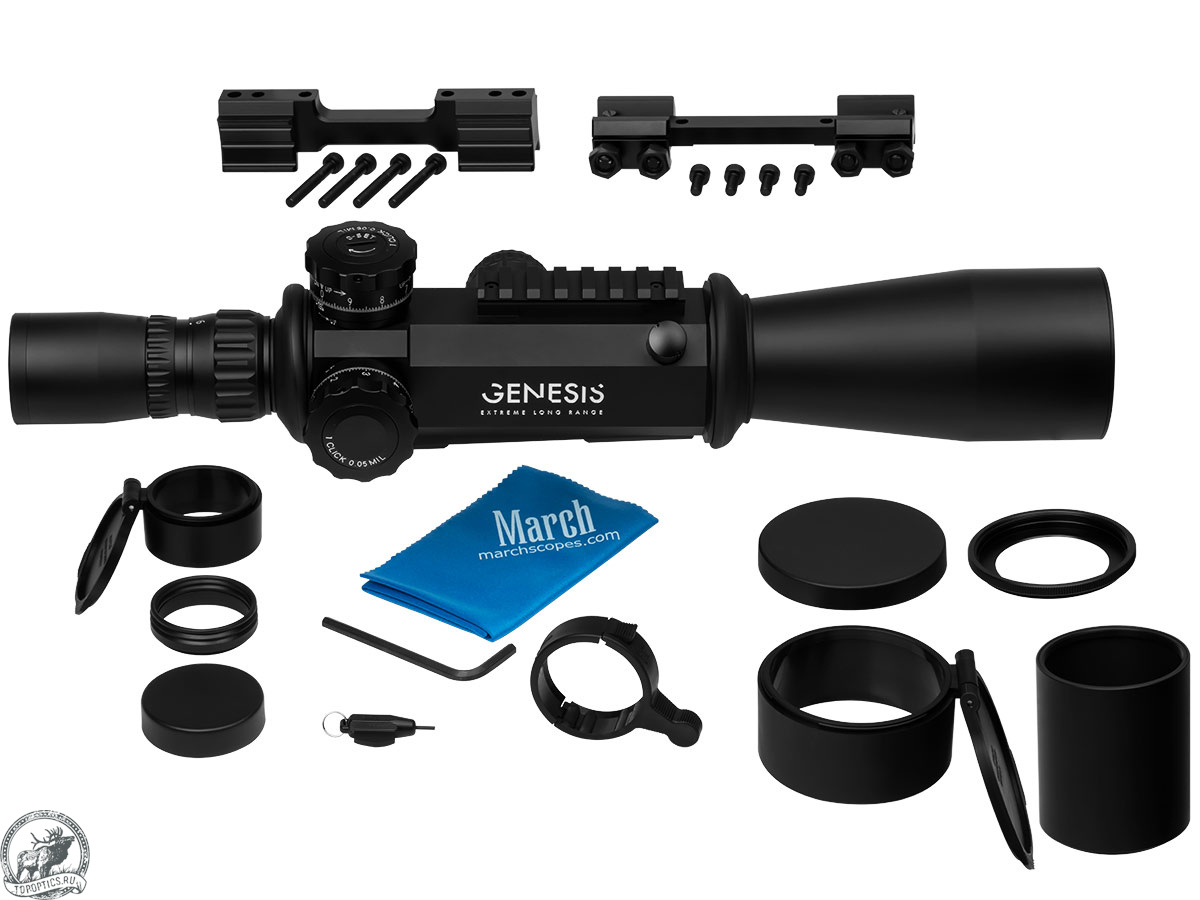 Прицел March Genesis 6-60x56 предназначен для стрельбы на дальние и сверхдальние дистанции. Его можно использовать при стрельбе от 20 метров до 4,5 километров. Благодаря превосходной оптической системе High Master, низкодисперсионным линзам Super ED, а также уникальному дизайну Genesis (сам прицел наклоняется), позволяющему стрелку всегда видеть через центральную часть объектива, прицел обеспечивает максимальную чёткость и минимальные хроматические аберрации даже при введении поправок на экстремальные 114MIL.