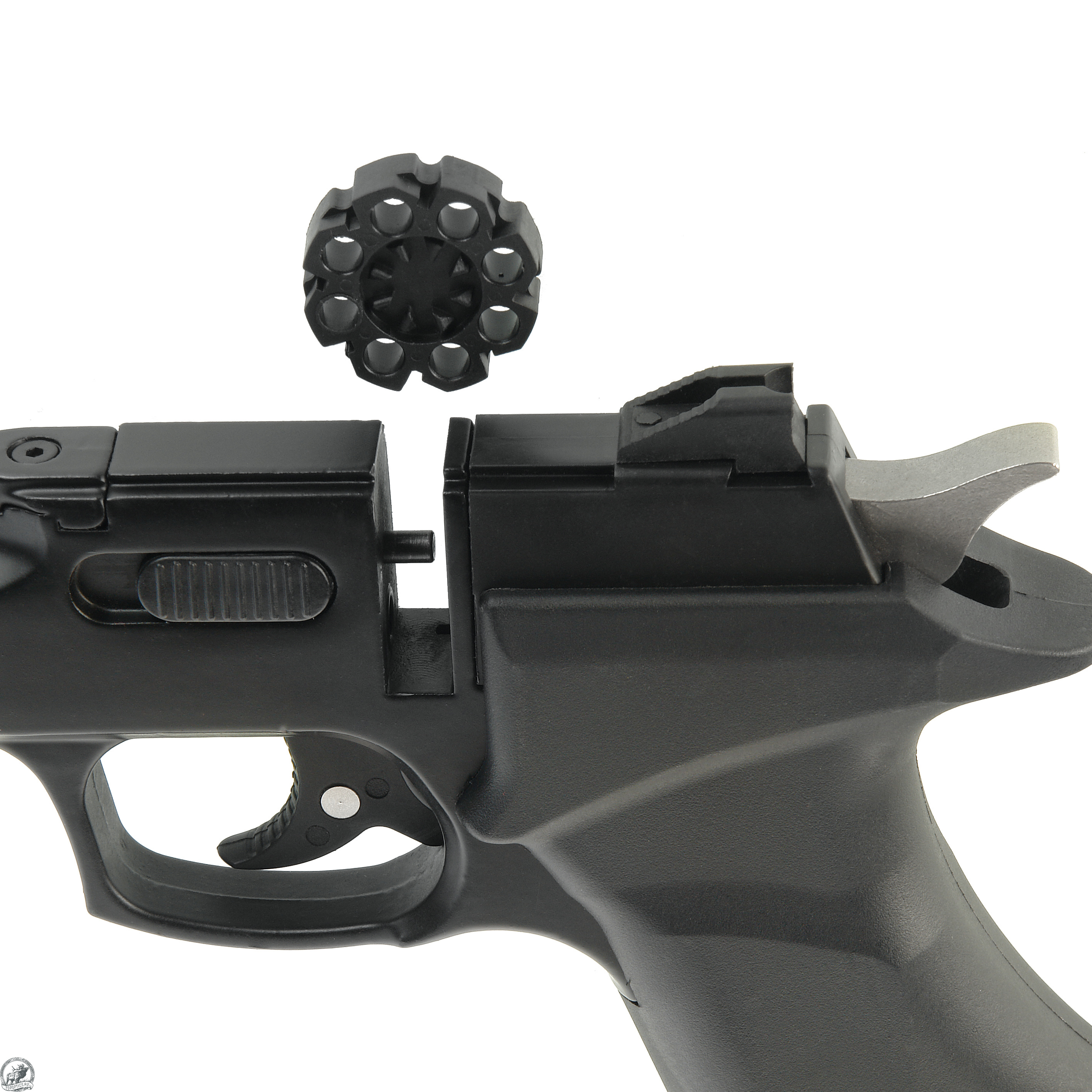 Барабан рассчитан на 8 пуль. Самовзводный ударно-спусковой механизм приводится в действие углекислым газом: используются баллоны СО2 на 12 г. Одного баллона хватает на 30 выстрелов. Гнездо для баллона находится в рукоятке.