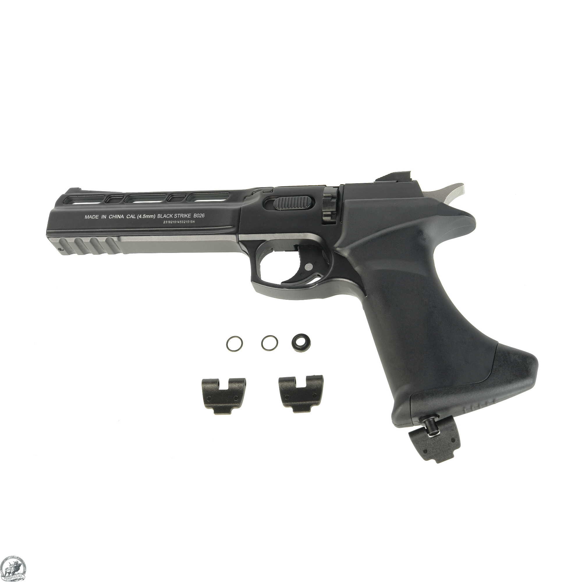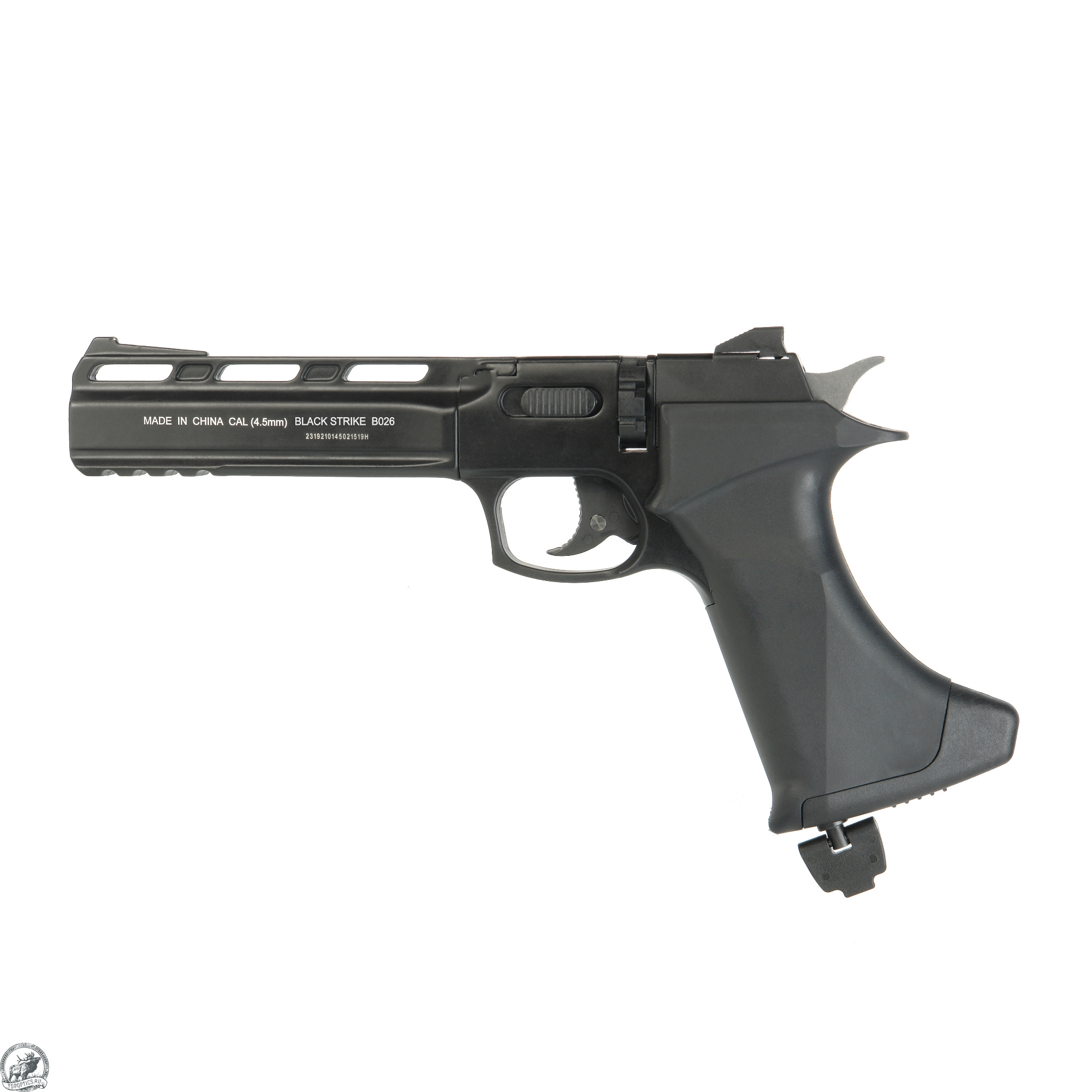 BLACK STRIKE «В026» – газобаллонный пневматический пистолет револьверного типа с барабаном. Предназначен для любительской стрельбы в тире, а также за городом в местах, отвечающих всем нормам безопасности.
