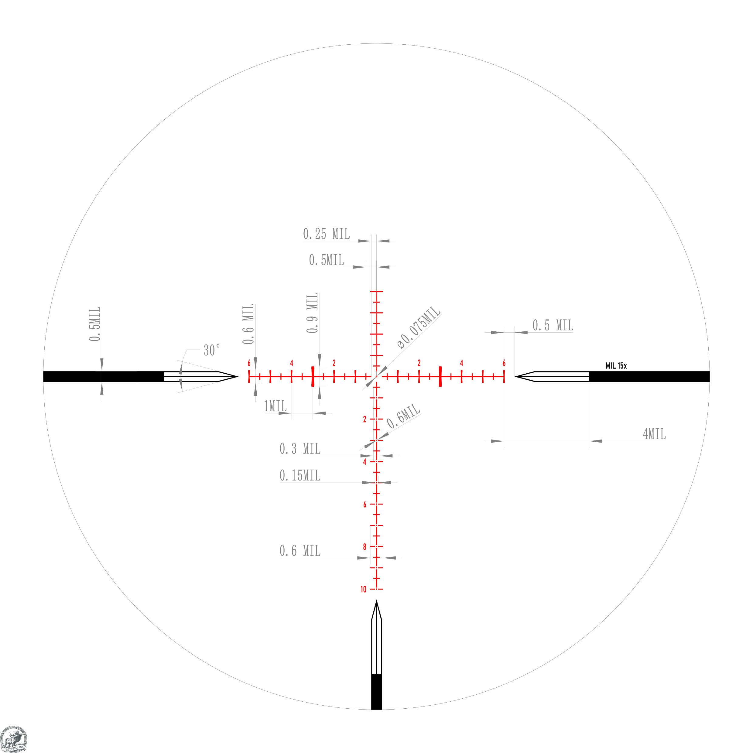 Тактическая прицельная сетка расположена на второй фокальной плоскости и не меняет видимый размер при изменении кратности прицела.