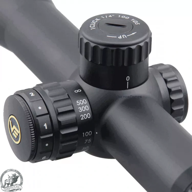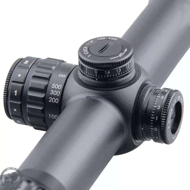 Барабаны классические охотничьи: низкие, с крышками, без блокировки положения. Ключевая особенность — подпружиненная система сброса на новый «ноль»: после пристрелки барабанчик оттягивается до упора вверх / вбок и прокручивается до «нулевого» маркера, затем опускается, фиксируя настройки. Поправки вносятся с шагом 1⁄4 MOA (или 7,3 мм/100 м), клики хорошо различимы тактильно и на слух. Дополнительный высокий барабанчик без разметки (и блокировки) может использоваться для расширения диапазона поправок на дальность или для использования другого шага поправок, например, в мрад.
