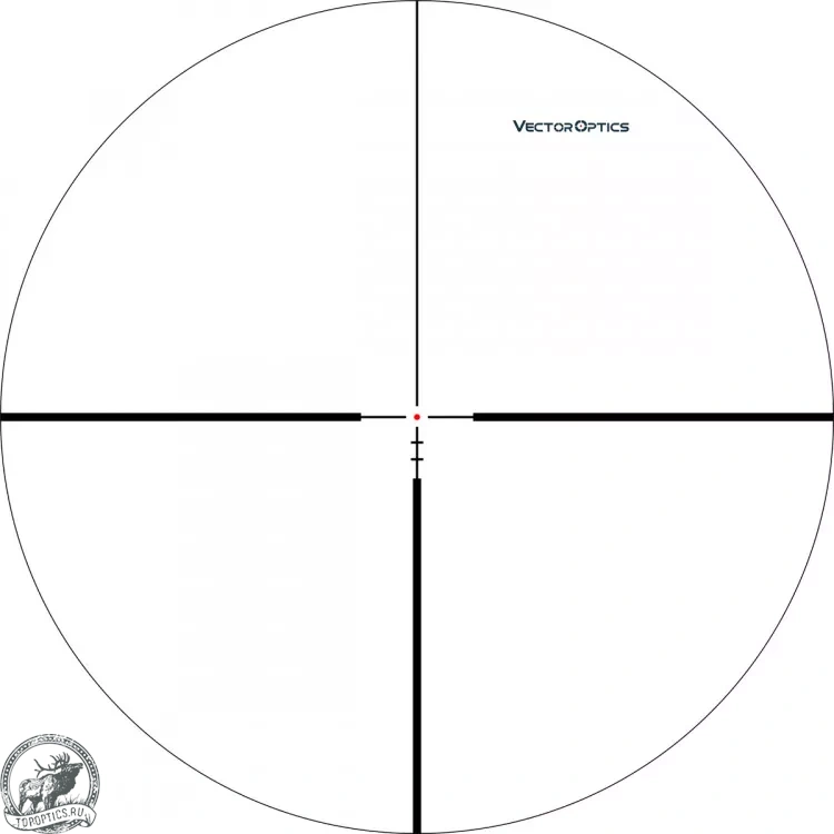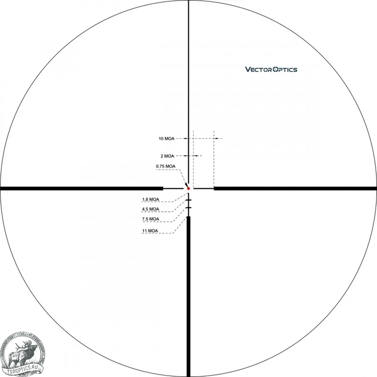 Сетка VET-10BDC — одна из модификаций German 4, охотничья классика для ближних и средних дистанций: перекрестье шириной 20 MOA быстро «ловит» цель при 3x, а «плавающая» центральная точка 0,75 MOA даёт точное наведение по месту при 18x. Сетка находится на 2-м плане (SFP) и на любой кратности выглядит одинаково, разметкой не перегружена и цель, даже маленькую, не перекрывает; правильные угловые размеры даны для 18x. В отличие от VECON-CDM, дополнительной разметки для стрельбы выносом не имеет.