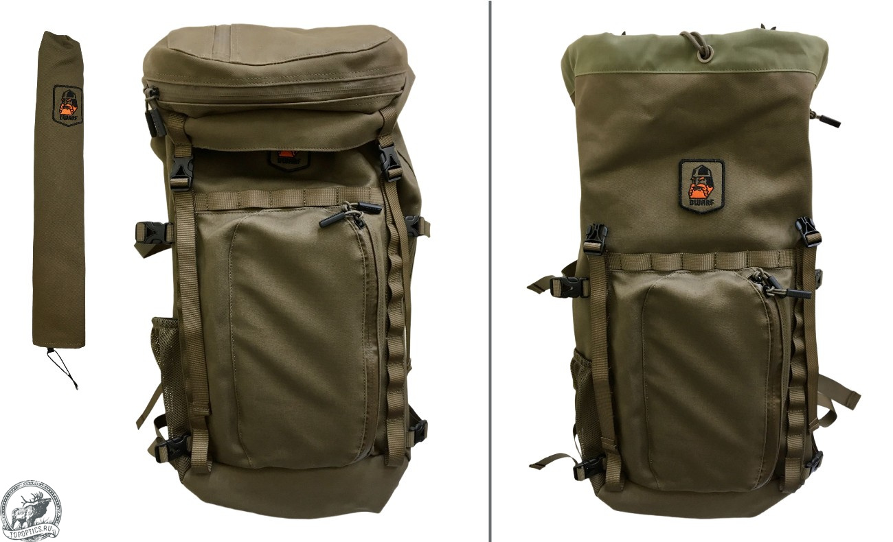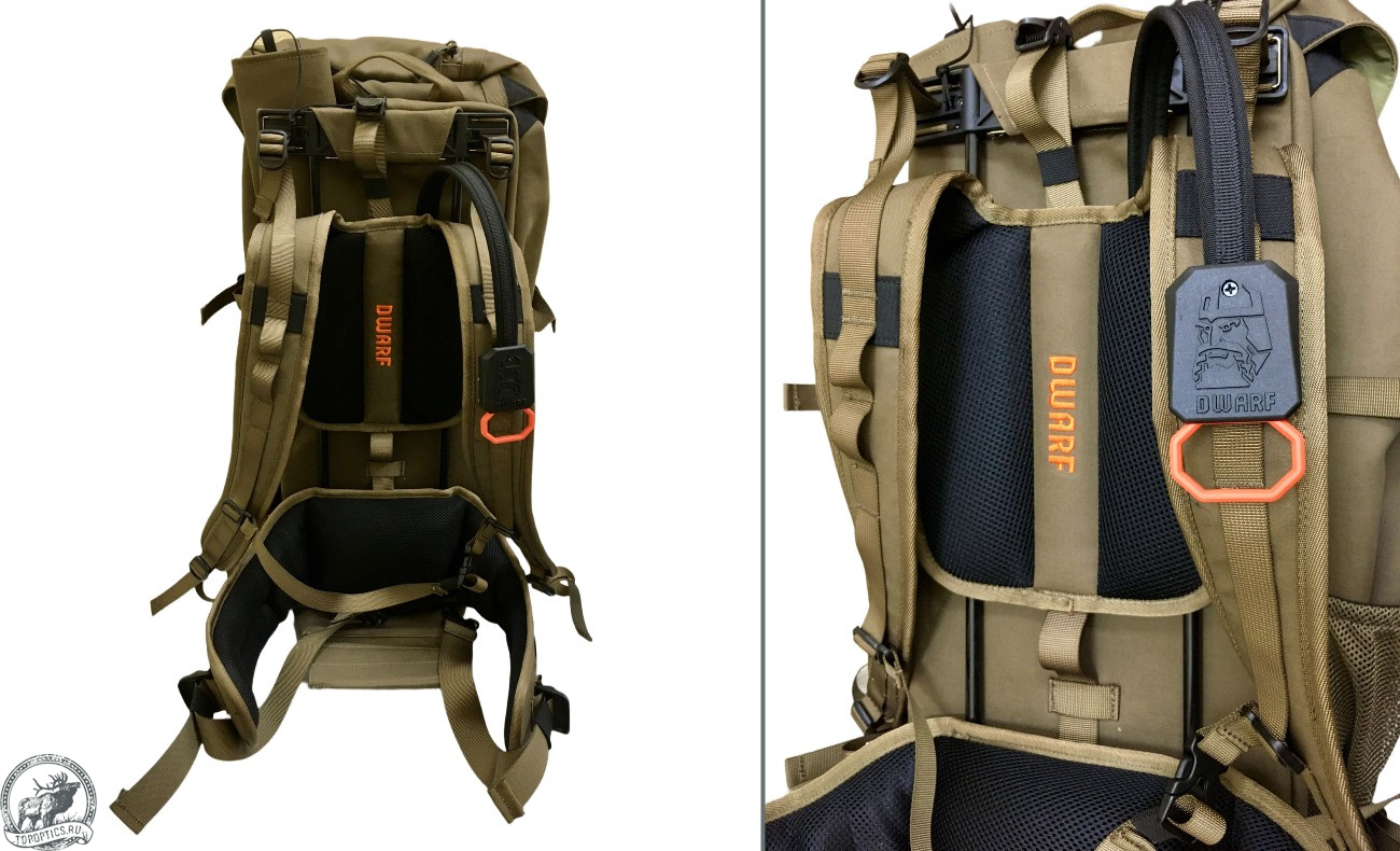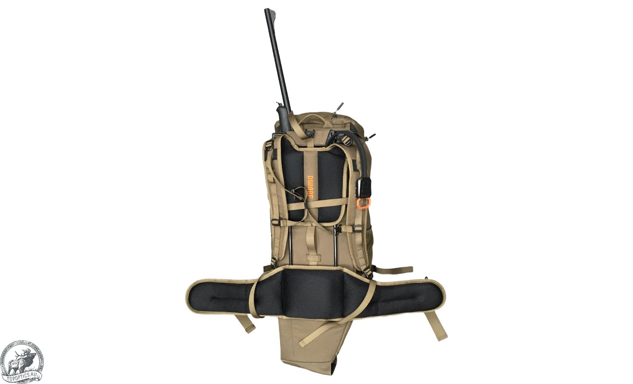 Рюкзак DWARF – 45L оснащён системой подачи оружия, уже знакомой российским охотникам и хорошо себя зарекомендовавшей. На плечевой лямке рюкзака расположено кольцо, потянув за которое можно легко раскрыть оружейное отделение и взять оружие, не снимая рюкзак со спины. Рюкзак подходит практически для любого охотничьего оружия, в том числе с установленным прицелом и сошками. Длина оружейного отделения регулируется со стороны приклада. Для защиты ствола (или блока стволов) от осадков, лесного сора в комплект входит плотный защитный чехол с вышитым логотипом DWARF.
