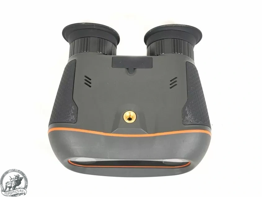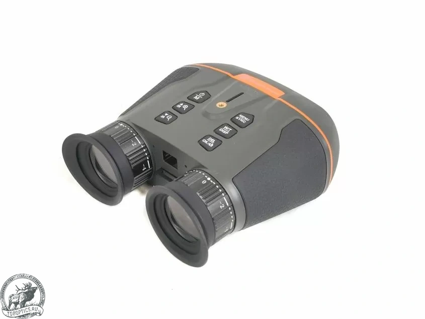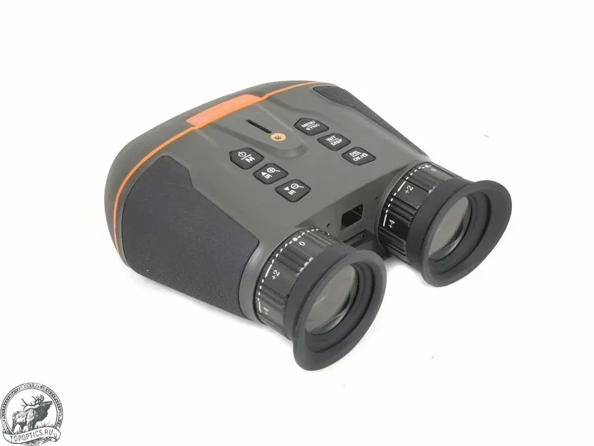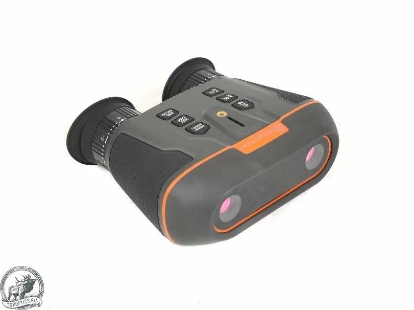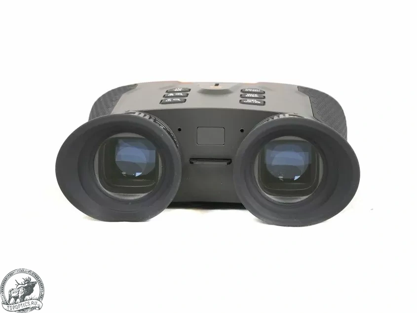 Прибор оснащен двумя объективами с фокусным расстоянием 5,58 мм и светосилой F1.2. Пространственный угол поля зрения FOV (Field of view)58° позволяет охватывать широкую область пространства размером 110 метров на удалении 100м. Встроенный цифровой зум до 12х дает возможность приближать изображение любого удаленного объекта и рассматривать его в мельчайших подробностях. В меню доступна регулировка экспозиции, ISO и других параметров, что позволяет адаптировать изображение под различные условия освещения. Для удобства предусмотрены кольца диоптрийной настройки каждого окуляра и функции синхронизации дисплеев, позволяющие настроить картинку под индивидуальные особенности зрения.