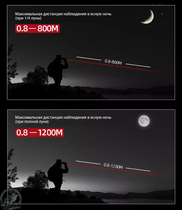 - Видимость при Луне до 1200 м, в полной темноте в подсветкой до 300 м.