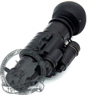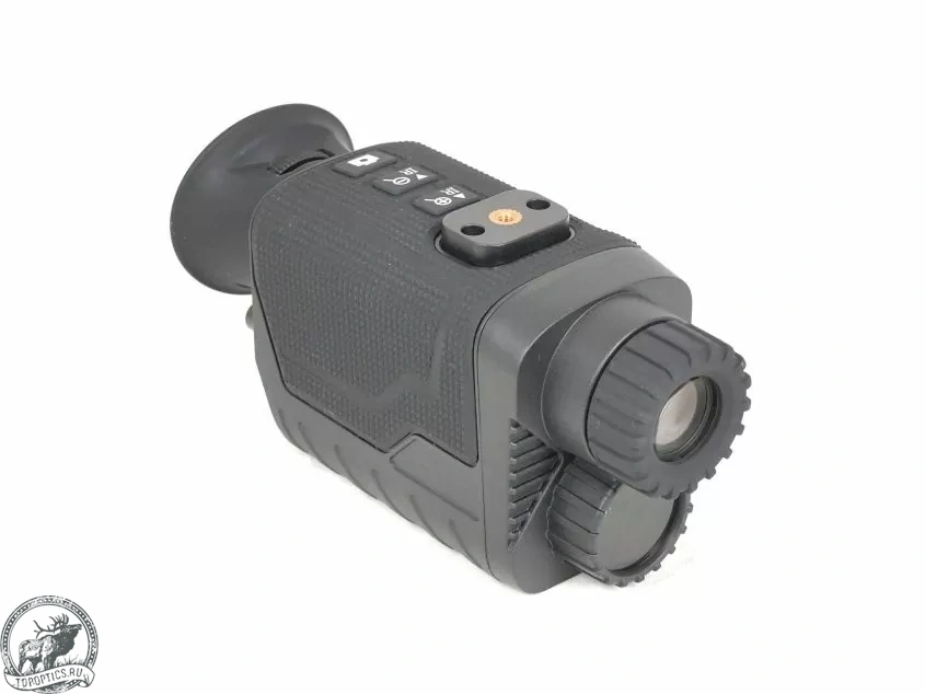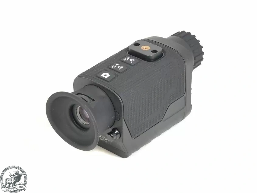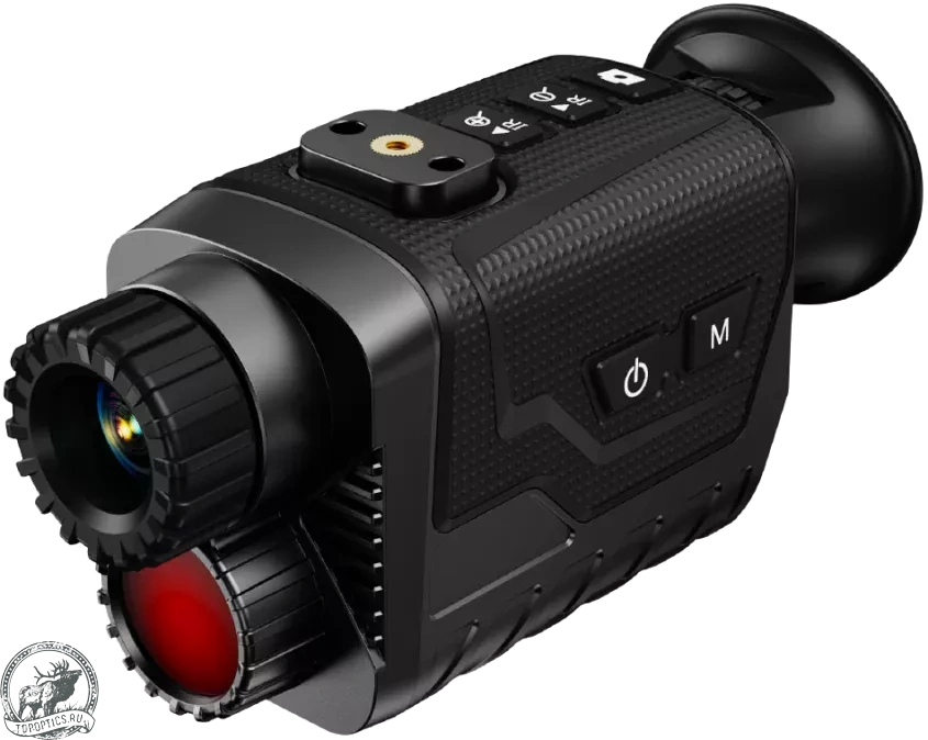 Объектив монокуляра имеет фокусное расстояние 25 мм и светосилу F1.2. Это сочетание позволяет получать ясное изображение даже при слабом внешнем освещении. Оптическое увеличение составляет 1х, что сохраняет естественные размеры объектов и облегчает ориентирование на местности. Цифровой зум доступен в диапазоне от 1х до 8х и открывает возможность рассматривать удаленные объекты с высокой степенью приближения. Пространственный угол поля зрения FOV равен 10°, что соответствует видимому участку пространства размером 17,5 м на дистанции 100 м. Для индивидуальной подстройки изображения под особенности зрения прибор оснащен механизмом диоптрийной корректировки. Механизм фокусировки находится на объективе, низкопрофильное кольцо с насечкой позволит манипулировать тонкими настройками даже в перчатках.